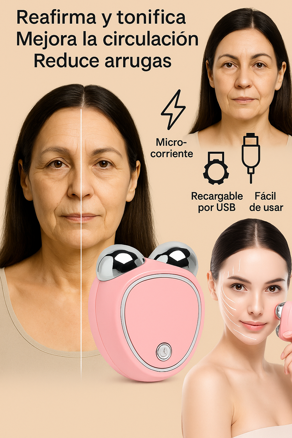 3. Desliza el cabezal siguiendo los músculos del rostro, siempre hacia arriba y hacia afuera.